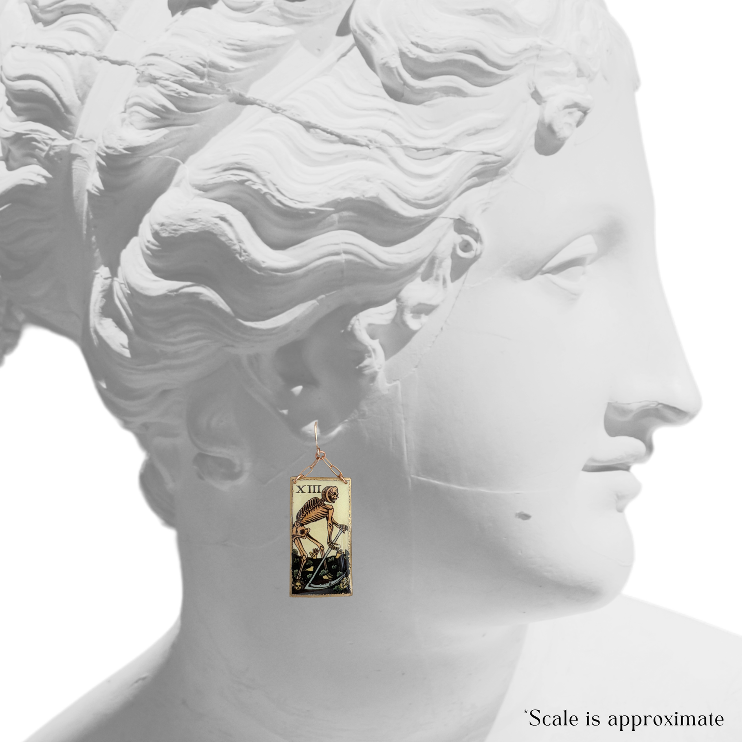 Featuring richly printed Italian paper by Tassotti, these earrings depict Death (XIII) and The Devil (XV) from the Tarot de Marseille — one of the earliest known tarot decks, first emerging in Northern Italy and later beloved in 17th–18th century France.