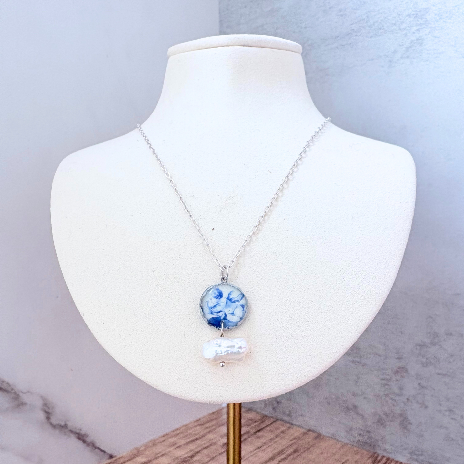 Featuring imagery from 19th-century Sèvres porcelain, this tiny Dulcet pendant (0.5", 12.7mm) is handcrafted with paper, resin, and sterling silver. A luminous Biwa pearl dangles below in a soft, organic shape.
