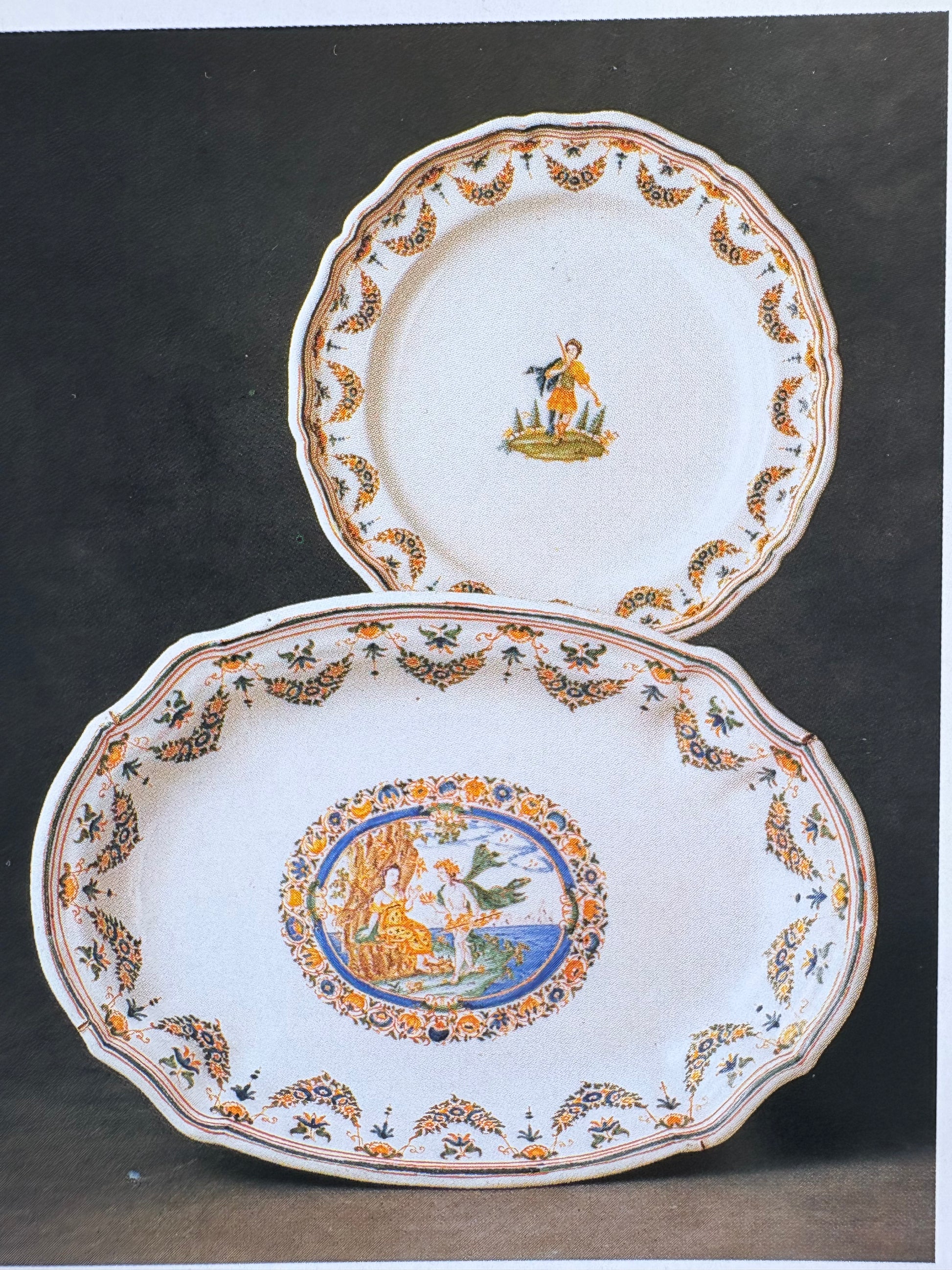 Imagery from 18th-century Moustiers faience, showing a cheerful country musician in ochre clothing, captured mid-tune with a small violin tucked under his chin. These playful pastoral performers were a favorite subject in faïence Français — lighthearted, musical, and full of movement.