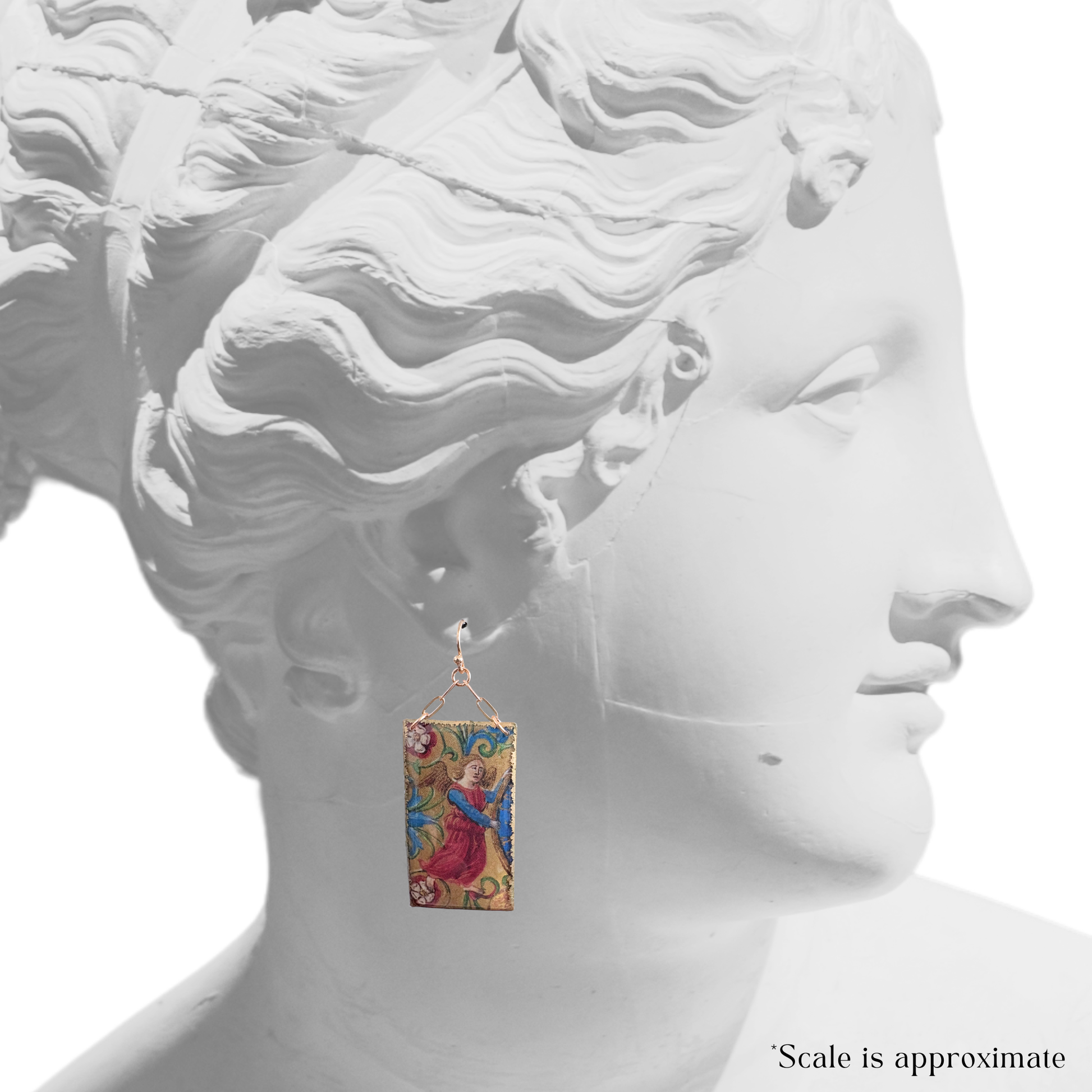 Featuring imagery from a late-medieval illuminated manuscript, these chain dangles capture two small angels tucked between gilded vines and botanical flourishes. I love how manuscripts hid these tender figures in the margins—little guardians peeking out from centuries-old pages.