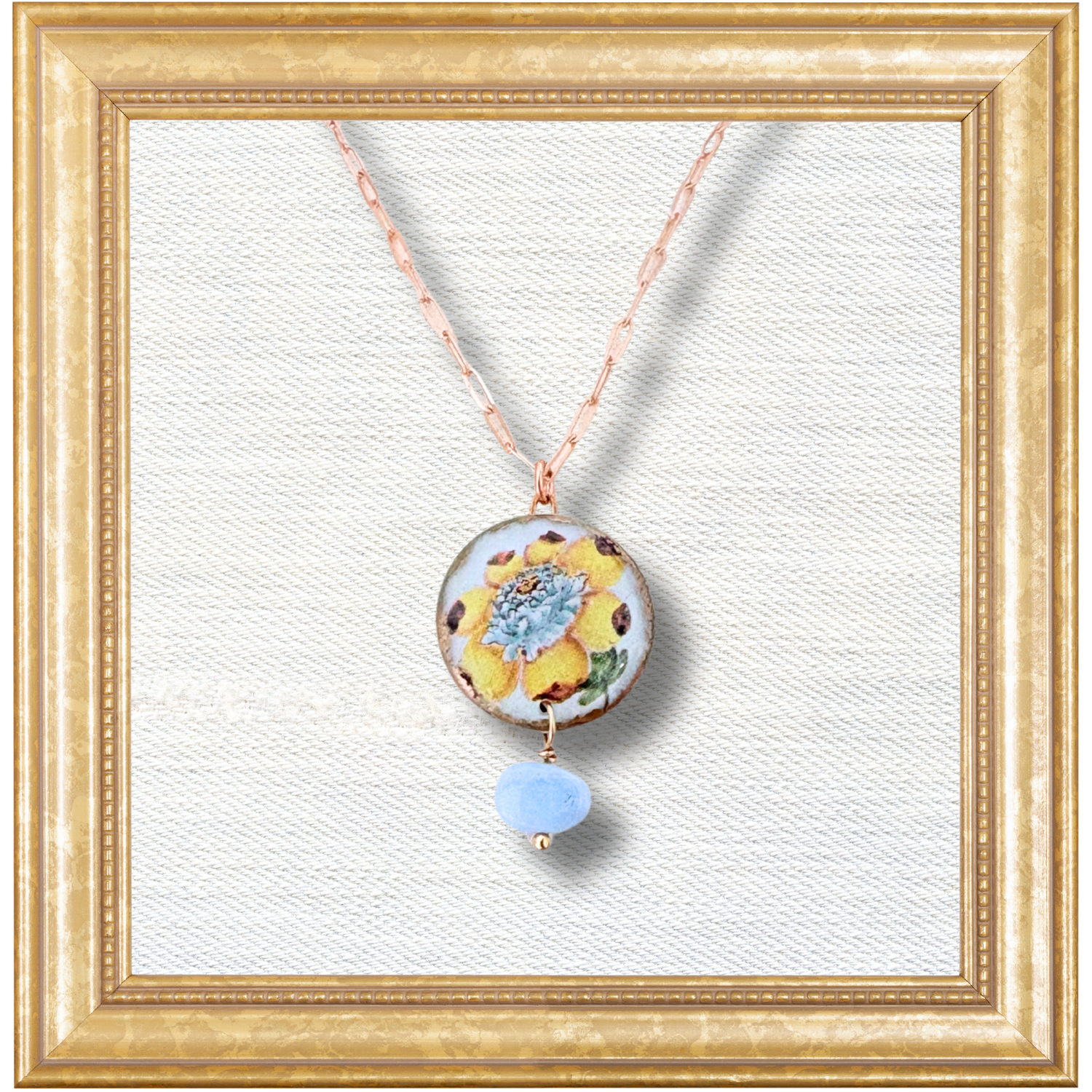 A bright floral moment from 18th-century Faïence Français, with sunny yellow petals and a soft blue center. The drop of African blue opal adds a gentle, milky glow.