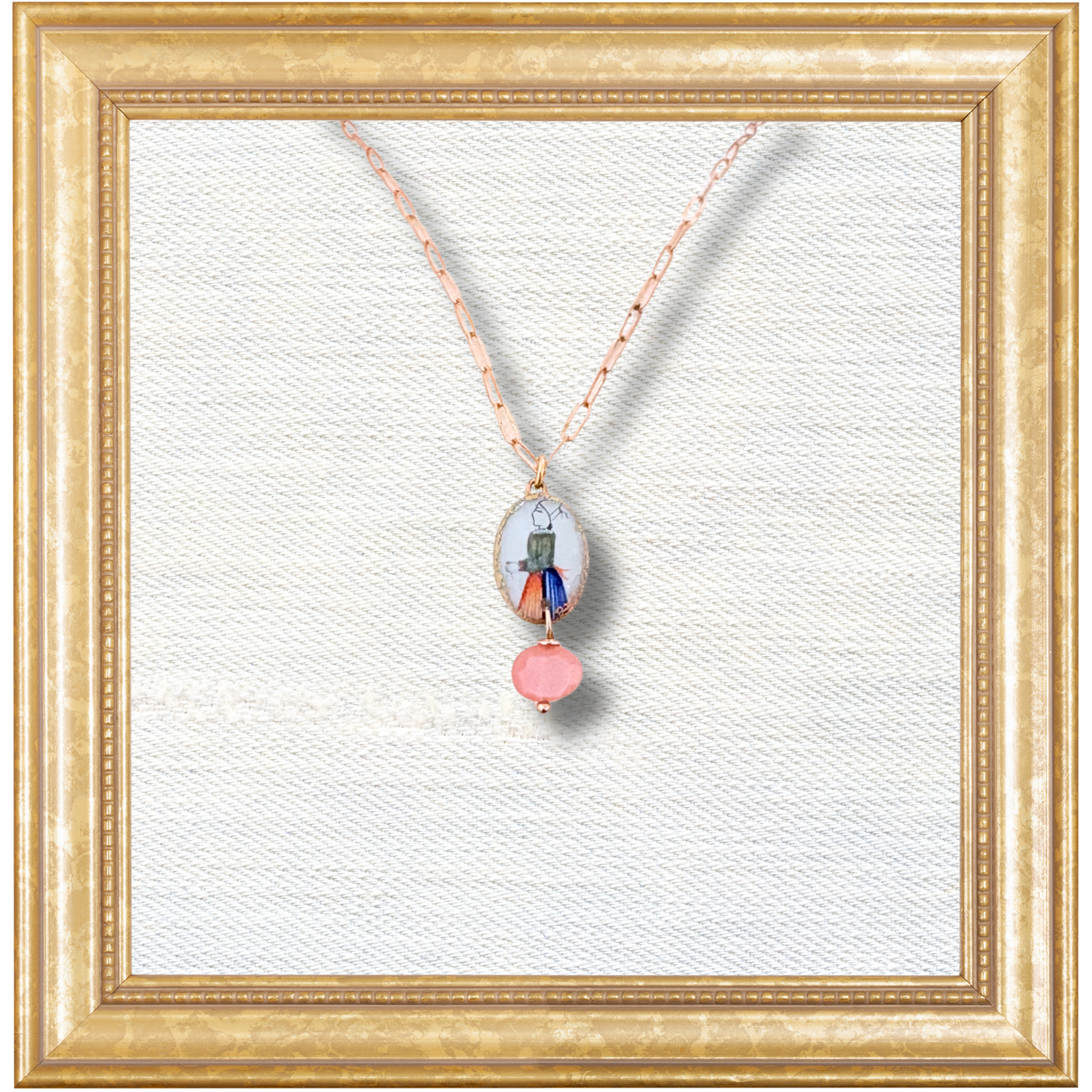 Featuring imagery from a Victorian tile, this petite Pixie pendant (14×10mm) captures a tiny painted girl mid-twirl, her bright skirt fanned out as if she’s about to dart off into some miniature adventure. A soft peach moonstone drop adds a gentle, rosy glow. Finished with a 16–18" bronze chain.
