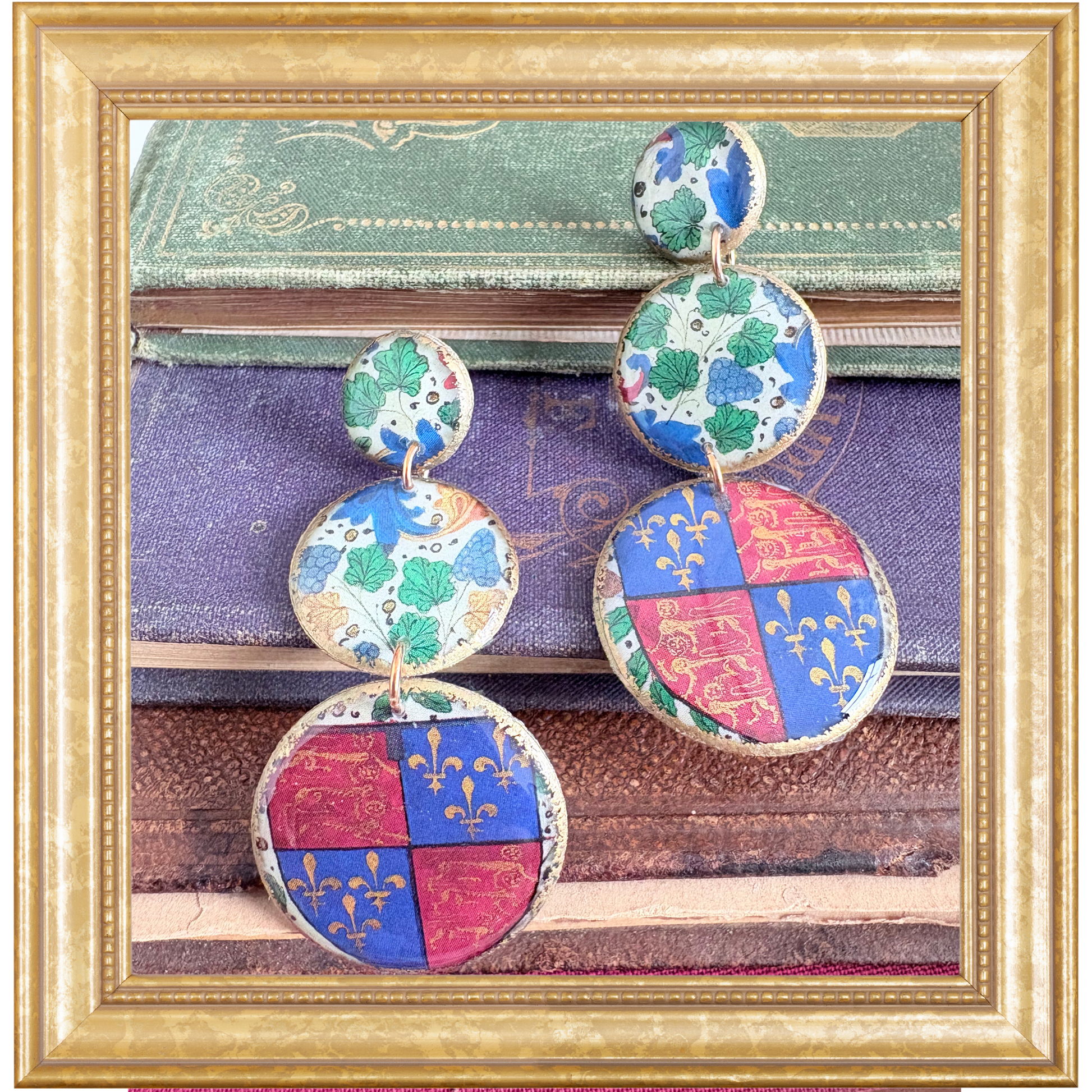 Featuring imagery from a 1506 French translation of Xenophon’s Anabasis—a lavishly illuminated manuscript created for Henry VII and gifted to him by Claude de Seyssel—these earrings draw from two distinct parts of the book: the bright, detailed marginal florals and the richly painted Tudor arms that mark the manuscript’s opening pages.
