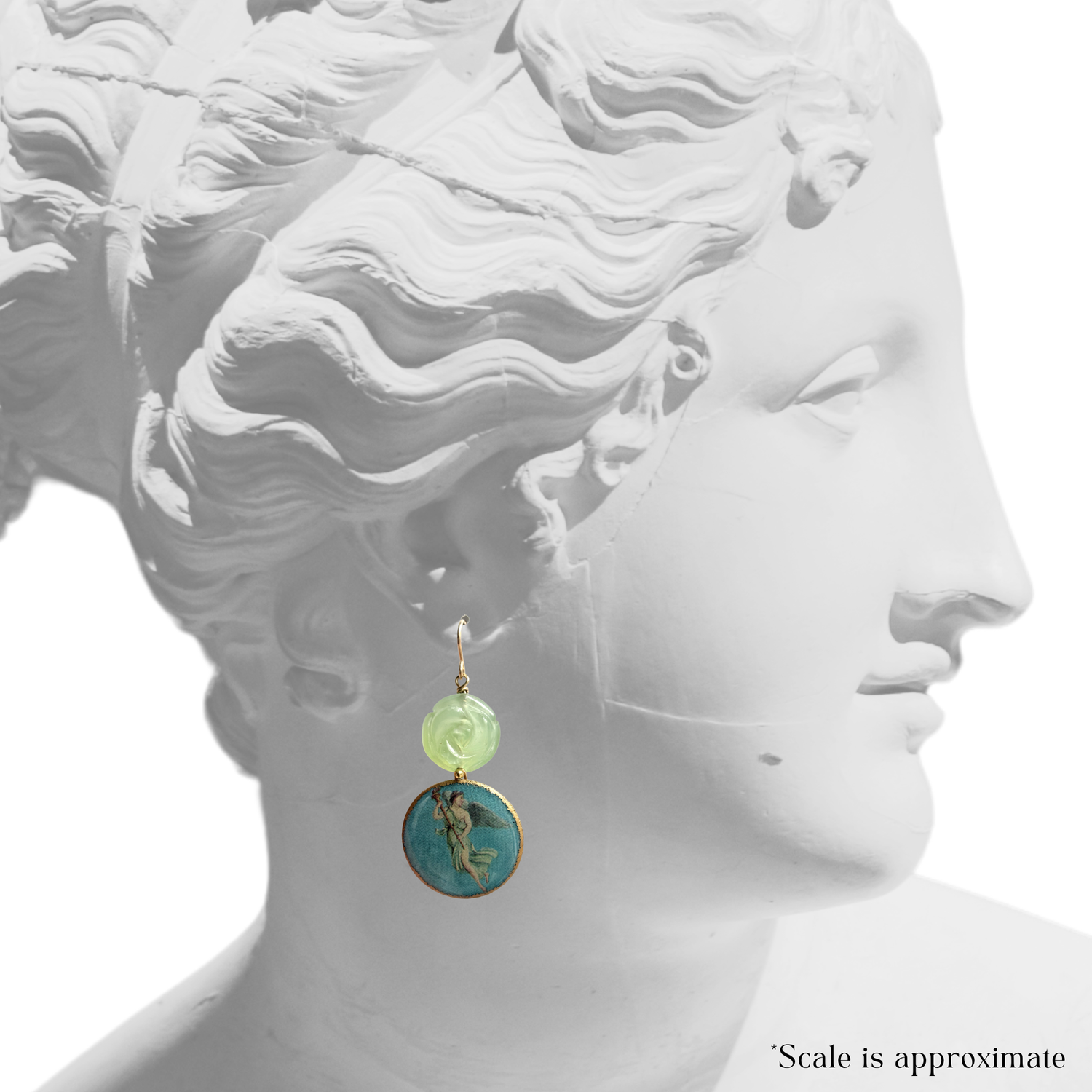 Drawn from Robert Adam’s neoclassical interiors, these earrings feature winged figures in motion — celestial messengers rendered in shades of turquoise and cream. Their graceful forms carry a sense of movement and lightness, as though they might lift from their gold-edged frames at any moment.